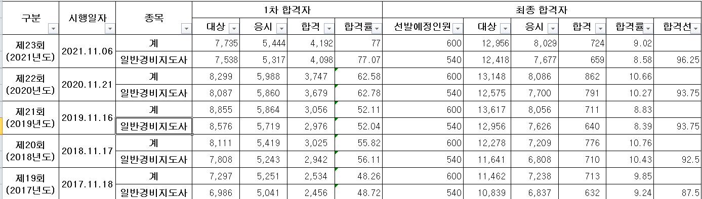 오늘은 2023년 경비지도사 시험일정과 합격률 등에 대해 알아보았습니다. 상당한 난이도를 가지고 있는 시험으로 많은 관심을 가지는 자격증으로 보여집니다만, 쉽지 않은 자격증임에는 틀림없습니다. 올해 취득을 목표로 하신다면 관련 경력이 있는 분들이 우선적으로 도전해보시는 것을 추천 드립니다.