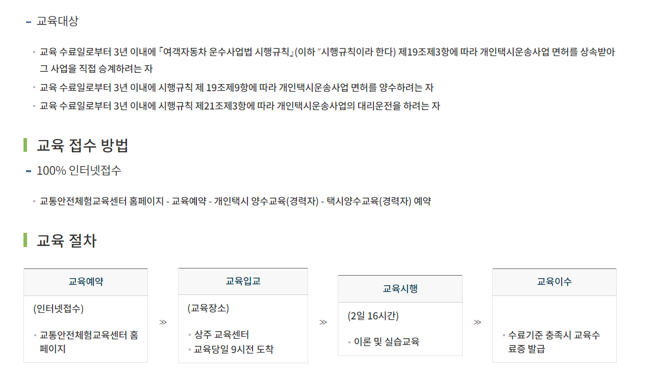 그러나 2021년 이제 법인택시 5년 경력이 사라졌습니다. 택시 운전 유무와 상관없이 자신 5년 이상 무사고라면 개인택시면허 양수요건 교통안전교육을 5일간 받으면 개인택시 자격조건을 취득하게 됩니다.