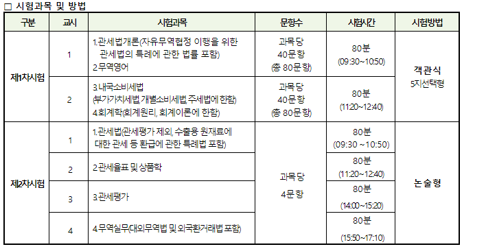 1차 시험에서는 관세법개론, 무역영어, 내국소비세법, 회계학을 시험봅니다. 과목당 40문항이 있으며 과락은 40점, 그리고 평균 60점 이상 득점해야 통과할 수 있습니다.