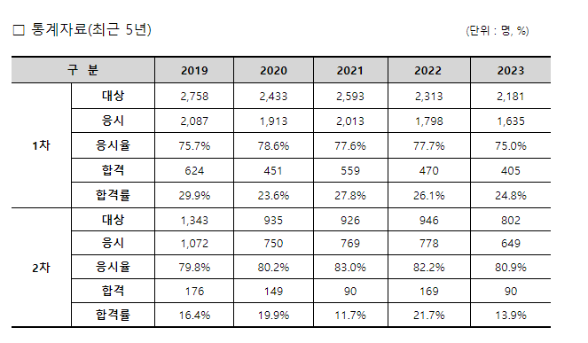합격률을 한번 보시면 1차 시험 또한 합격률이 25%를 왔다갔다 합니다. 4명중 3명은 탈락한다는 뜻입니다.