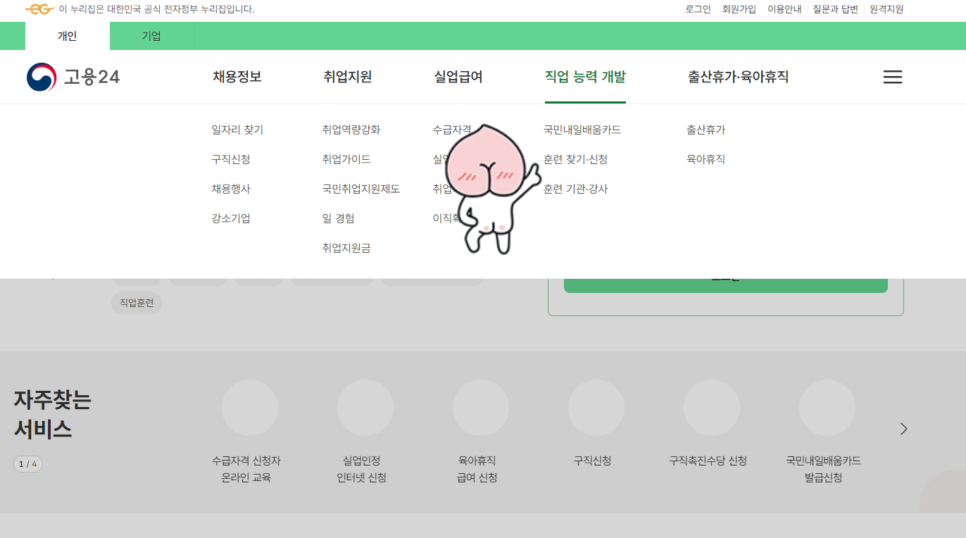 국비지원을 받을 수 있는 훈련시설을 찾기위해서는 고용24를 검색하여 들어가 줍니다. 검색창에 검색하시면 금방 찾을 수 있습니다. 여기서 직업능력개발 카테고리에서 훈련찾기를 클릭합니다.