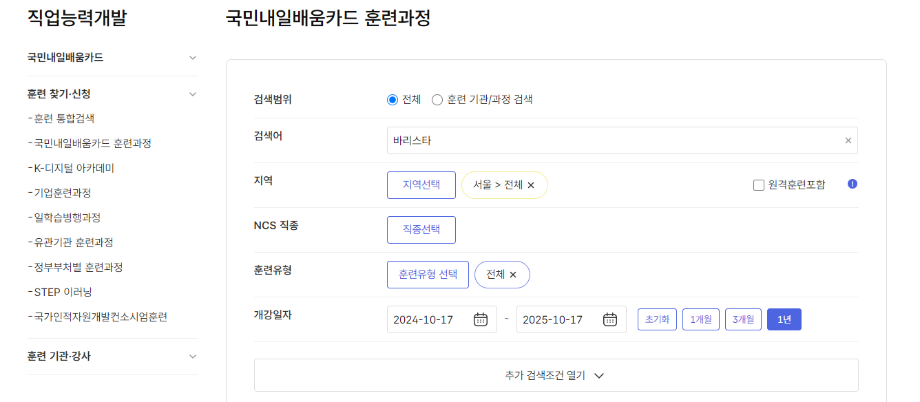 검색어에 바리스타를 검색해 주면 관련된 교육기관들이 검색이 되게 됩니다. 지역별로도 검색이 가능해서 내가 가기 쉬운 곳들을 검색하여 등록하시면 됩니다. 수강료는 대부분 20만원 내외로 책정되어 있어 많이 부담스러운 정도는 아닙니다. 전액을 국비지원받기는 어렵고 어느 정도의 금액을 지원받을 수 있습니다.