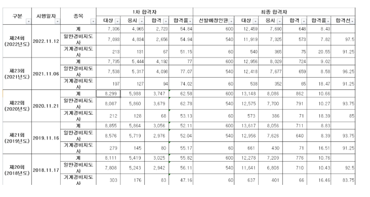 과거 합격 점수를 살펴보면, 2차 시험에서 상당히 높은 점수를 받아야 합격선에 도달할 수 있었습니다. 객관식 시험이지만, 거의 모든 문제를 맞춰야 합격을 기대할 수 있는 수준입니다.