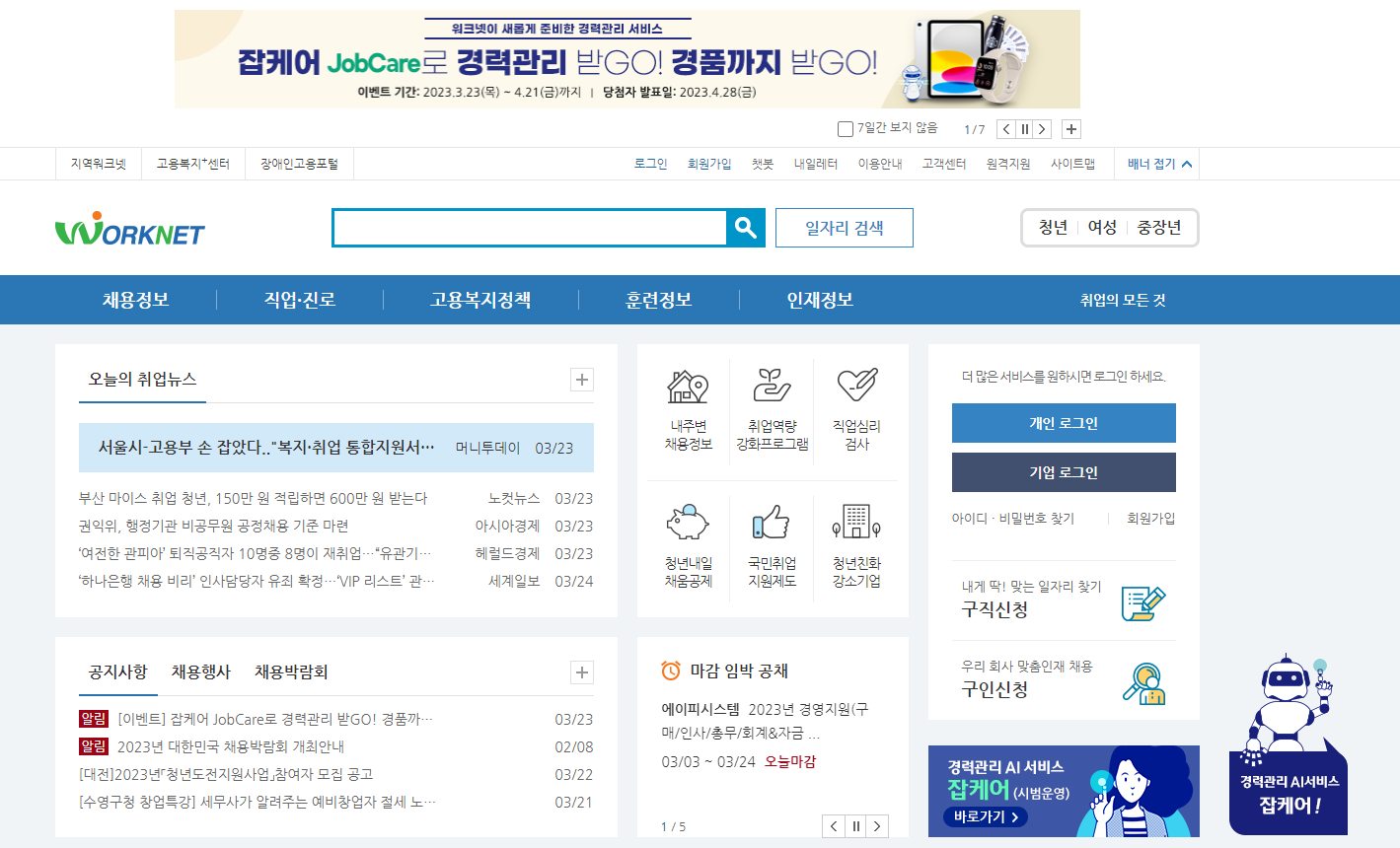 워크넷은 채용정보뿐만 아니라 중장년층에 대한 잡케어, 정보, 고용복지 정책까지 모두 확인이 가능합니다. 주로 20,30대가 이용하기 보다는 그보다 연령대가 있으신 분들 40~50대가 주로 이용한다고 보시면 됩니다. 오늘은 요양보호사 구인구직만 보고 있으니 요양보호사에 대한 정보를 확인해보도록 하겠습니다.